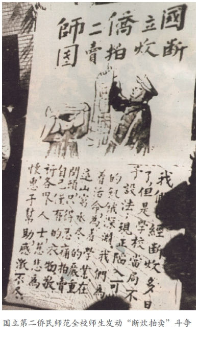 由于國民黨政府貪污腐敗,加上當(dāng)時貨幣貶值、物價暴漲,1948年秋季僑二師出現(xiàn)了多次斷炊危機。在第四次斷炊時,校長和其他領(lǐng)導(dǎo)人甚至棄職逃走,讓學(xué)生自尋活路。為解燃眉之急,中共派廣州地下學(xué)聯(lián)到僑二師部署,組織全校師生發(fā)動“斷炊拍賣”斗爭。學(xué)生們將值錢的東西捐獻出來,掛在板車四周,高舉“國立僑二師斷炊拍賣團”“擦鞋隊”“賣花隊”的大牌和旗幟,浩浩蕩蕩奔赴漢民北路(現(xiàn)北京路)、惠愛中(現(xiàn)中山五路)、上九路、下九路和長堤等鬧市舉行拍賣活動。“斷炊拍賣”斗爭轟動一時,贏得社會各界廣泛的同情和支持。其間,廣雅、長風(fēng)、美華、培道、知用、市二中、中大附中、海事等學(xué)校和單位派代表前來慰問和捐獻。僑一師也致電慰問。據(jù)不完全統(tǒng)計,學(xué)校收到金圓券2.8萬多元、港幣434元、白米6200斤。