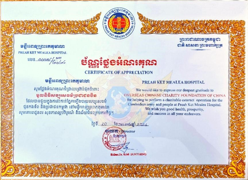 柬埔寨國防部向中國華僑公益基金會頒授的感謝狀