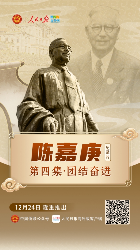 今年是陳嘉庚先生誕辰150周年,為深入學(xué)習(xí)貫徹習(xí)近平總書記2014年給廈門集美校友總會(huì)的重要回信精神,弘揚(yáng)新時(shí)代嘉庚精神,激發(fā)僑心向黨、團(tuán)結(jié)奮斗的強(qiáng)大力量,中國僑聯(lián)指導(dǎo)人民日?qǐng)?bào)海外網(wǎng)拍攝制作了四集紀(jì)錄片《陳嘉庚》。第四集《團(tuán)結(jié)奮進(jìn)》講述了中國僑聯(lián)弘揚(yáng)新時(shí)代嘉庚精神,團(tuán)結(jié)凝聚僑心僑智僑力同圓共享中國夢的探索和實(shí)踐。