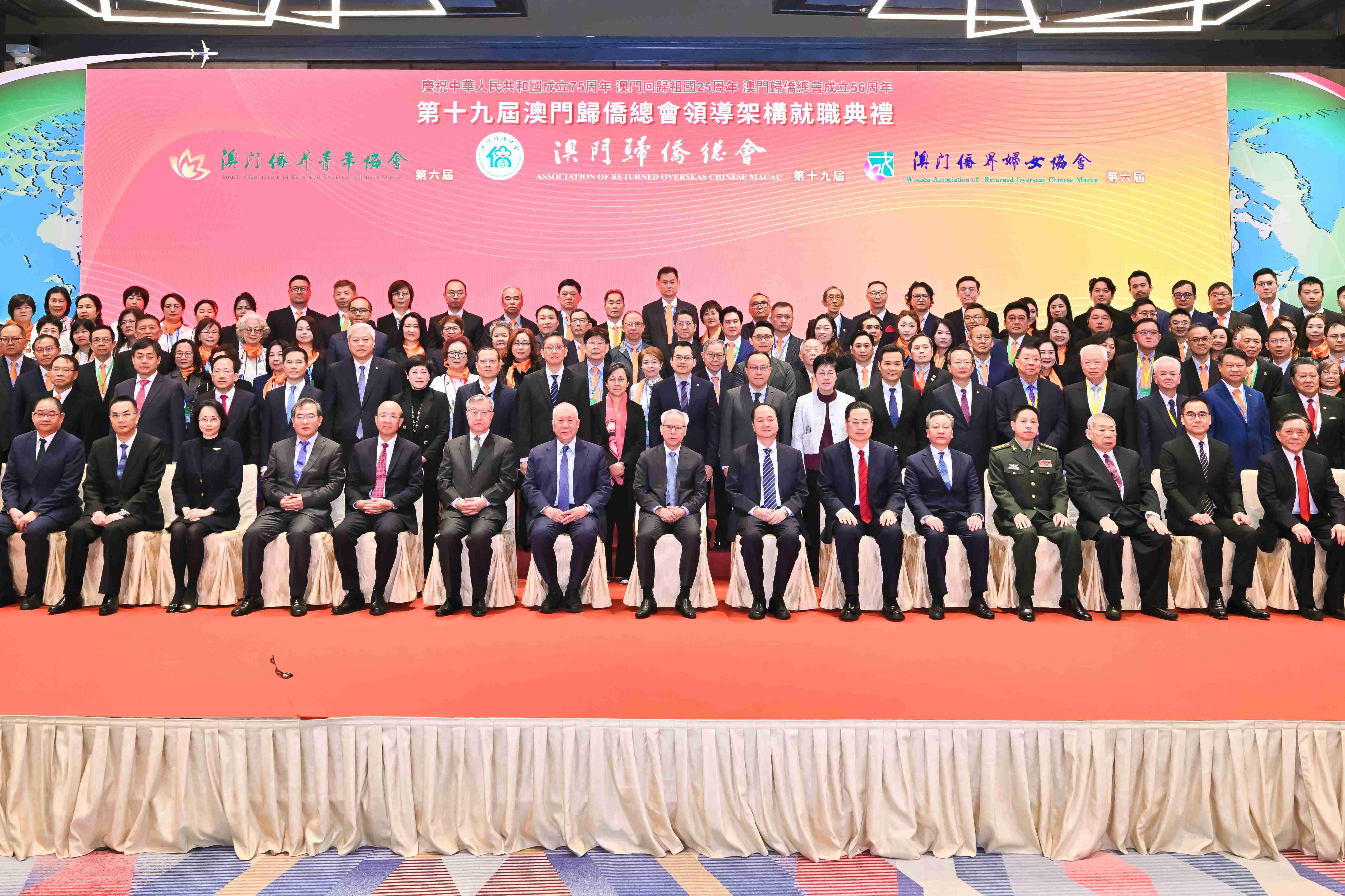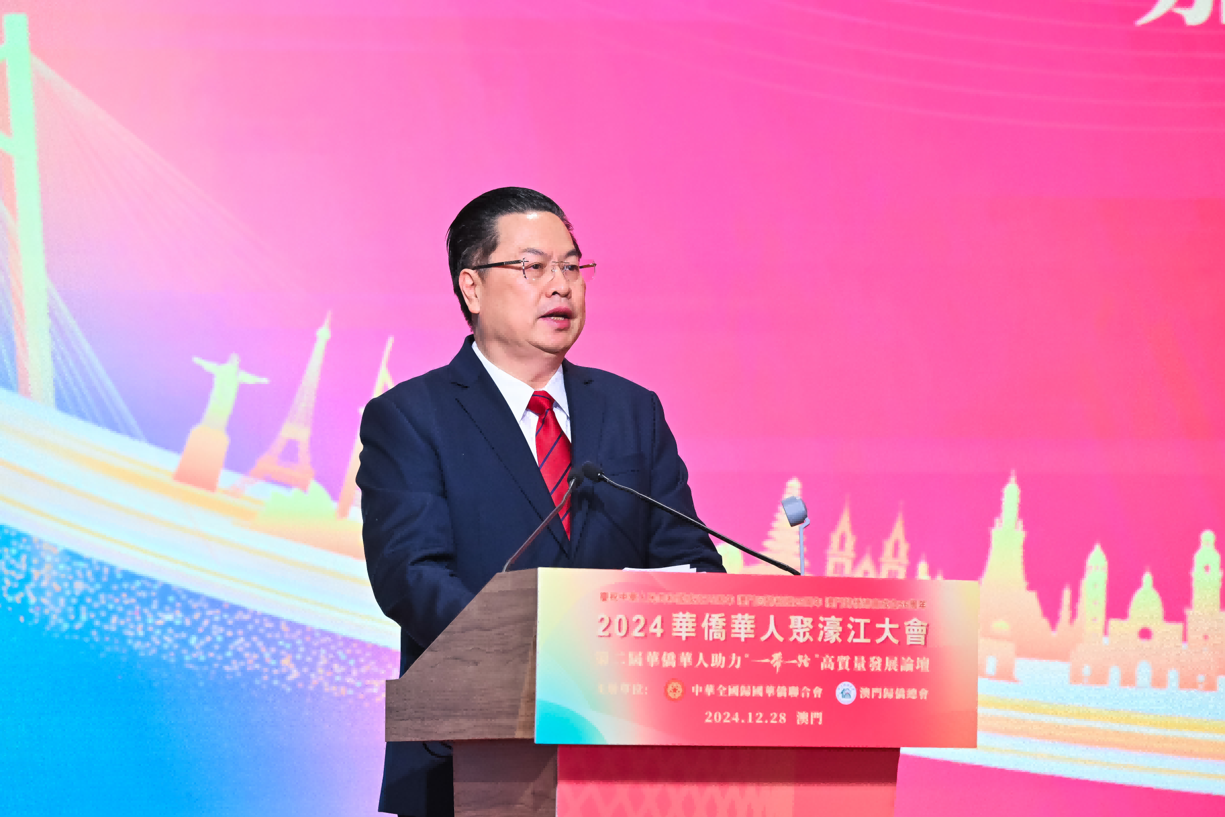 12月28日上午,由中國僑聯(lián)、澳門歸僑總會(huì)主辦的“2024華僑華人聚濠江大會(huì)”活動(dòng)暨第十九屆澳門歸僑總會(huì)領(lǐng)導(dǎo)架構(gòu)就職典禮在澳門旅游塔舉行。全國政協(xié)副主席何厚鏵、澳門特區(qū)行政長(zhǎng)官岑浩輝、中央人民政府駐澳門特別行政區(qū)聯(lián)絡(luò)辦公室主任鄭新聰?shù)瘸鱿顒?dòng),中國僑聯(lián)副主席程學(xué)源出席大會(huì)活動(dòng)并致辭,中國僑聯(lián)常委、澳門歸僑總會(huì)會(huì)長(zhǎng)劉雅煌率第十九屆澳門歸僑總會(huì)領(lǐng)導(dǎo)架構(gòu)宣誓就職并發(fā)言。新一屆澳門特區(qū)政府主要官員,全國政協(xié)港澳臺(tái)僑委員會(huì)、中華海外聯(lián)誼會(huì)、中央政府駐澳聯(lián)絡(luò)辦、外交部駐澳特派員公署、駐澳部隊(duì)等有關(guān)領(lǐng)導(dǎo),部分內(nèi)地及大灣區(qū)僑聯(lián)負(fù)責(zé)同志,以及來自80個(gè)國家和地區(qū)的僑領(lǐng)、僑青共1000余人參加了活動(dòng)。