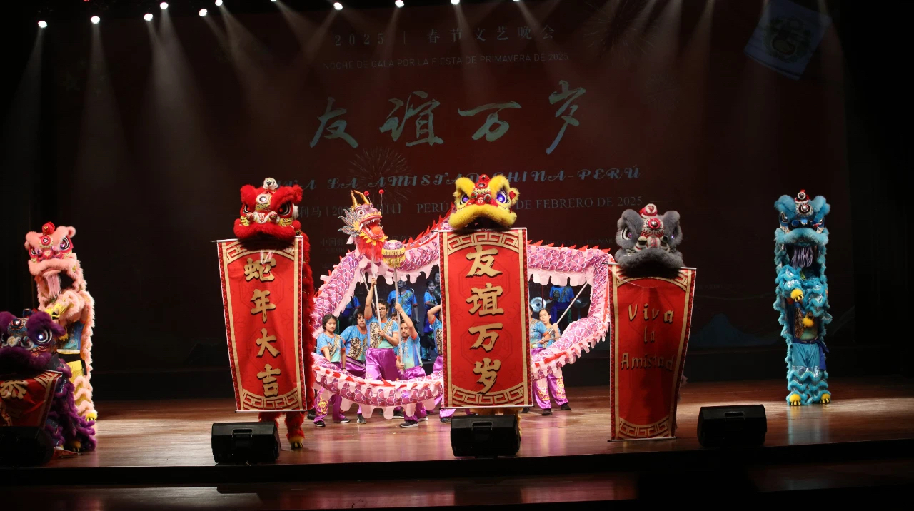 在現(xiàn)場,秘魯里卡多·帕爾馬大學(xué)孔子學(xué)院的師生表演舞蹈《亞馬孫與牡丹花》,若望二十三世秘中學(xué)校的師生帶來武術(shù)表演和二胡齊奏,慰僑訪演團演員傾情演唱秘魯民歌《山鷹之歌》……中外文化的交流與融合得以生動詮釋,不斷將“友誼萬歲”的主題點亮。最后,舞龍舞獅表演《友誼萬歲》將氣氛推向高潮,觀眾的掌聲、歡呼聲響徹劇院。
