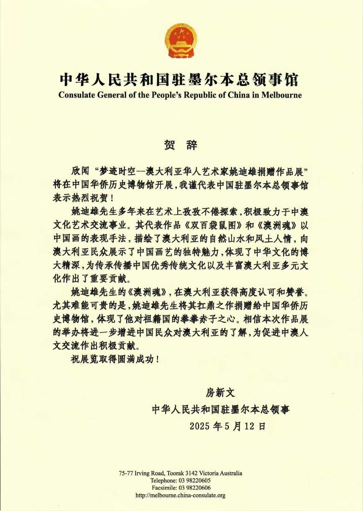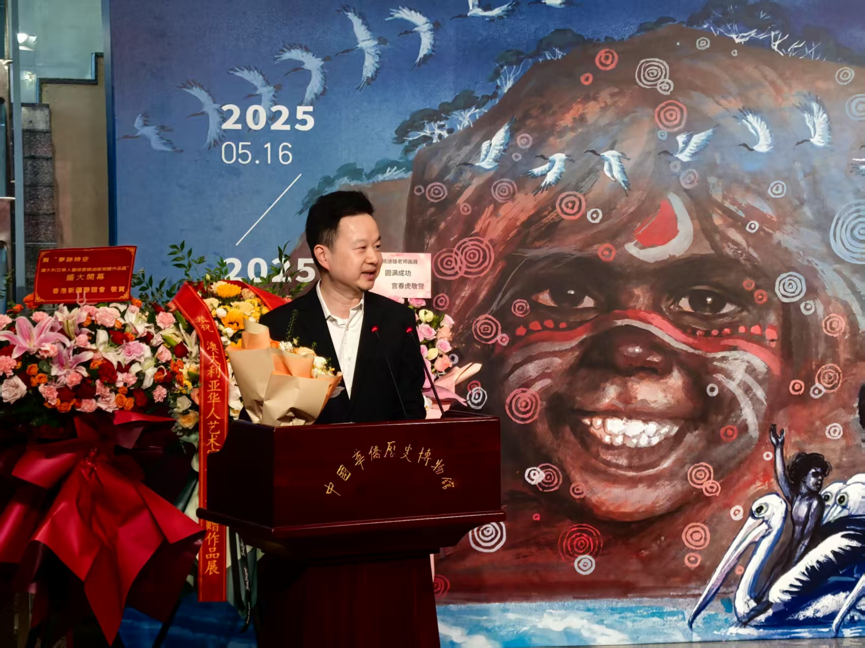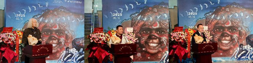 寧一在致辭中表示,“夢(mèng)”是人類前行的動(dòng)力源泉,華僑華人有著自己獨(dú)特而宏大的夢(mèng)想。華僑華人無(wú)論身處何方,都懷揣著家族興旺、家國(guó)繁榮的夢(mèng)想。中國(guó)夢(mèng),凝聚著全體中華兒女的共同期盼,海外僑胞作為其中重要的一部分,以各種方式積極參與中國(guó)的發(fā)展,為實(shí)現(xiàn)中國(guó)夢(mèng)貢獻(xiàn)自己的力量。構(gòu)建人類命運(yùn)共同體是全人類的共同夢(mèng)想,通過(guò)藝術(shù)交流,我們能夠打破隔閡,促進(jìn)不同國(guó)家、不同民族之間的理解與合作,攜手邁向人類命運(yùn)共同體的美好未來(lái)。“跡”是個(gè)人的行跡與經(jīng)歷,更是人類文明在世界上留下的印記。姚迪雄先生四十年來(lái)的跨文化創(chuàng)作歷程,不僅是他個(gè)人的成長(zhǎng)軌跡,更是無(wú)數(shù)華僑華人在海外拼搏的縮影。他們?cè)诓煌膰?guó)度,用自己的智慧和勤勞,為當(dāng)?shù)氐陌l(fā)展貢獻(xiàn)力量,同時(shí)也將中華文化傳播到世界各個(gè)角落,在人類文明的長(zhǎng)河中留下了獨(dú)特的印記。這些痕跡見證了華僑華人在百年未有的變局中,堅(jiān)守文化根脈,積極融入當(dāng)?shù)厣鐣?huì)的努力,成為世界了解中華文化包容性的重要窗口。“時(shí)”是最忠實(shí)的記錄者,時(shí)間見證了藝術(shù)家的成長(zhǎng)與蛻變。姚迪雄先生在漫長(zhǎng)的藝術(shù)生涯中,不斷積累、沉淀,其創(chuàng)作風(fēng)格隨著時(shí)間的推移逐漸成熟。多年來(lái),華僑華人作為中外交流的重要力量,在不同時(shí)期發(fā)揮著關(guān)鍵作用。他們促進(jìn)了文化、經(jīng)濟(jì)、科技等多領(lǐng)域的交流,藝術(shù)交流作為其中的重要組成部分,也在時(shí)間的推動(dòng)下不斷發(fā)展、深化。“空”是空間,華僑華人作為跨越國(guó)界的使者,在不同的空間和文明之間架起了溝通的橋梁。《澳洲魂》長(zhǎng)卷跨越了地域空間,展現(xiàn)出兩種文明在藝術(shù)空間中的對(duì)話。在現(xiàn)實(shí)生活中,華僑華人活躍于世界各地,將中華優(yōu)秀文化的魅力傳遞到海外,同時(shí)也把海外先進(jìn)的文化、理念帶回中國(guó)。他們?cè)诓煌拿鞯目臻g中穿梭,促進(jìn)中外文明的交流互鑒,讓不同的文化在交流中綻放光彩,實(shí)現(xiàn)“各美其美、美美與共”。