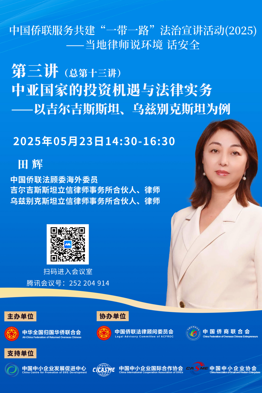 今年第三講(總第十三講)將于2025年5月23日(周五)14:30開(kāi)播,由中國(guó)僑聯(lián)法顧委海外委員吉爾吉斯斯坦田輝律師主講。田輝律師畢業(yè)于北京外國(guó)語(yǔ)學(xué)院俄語(yǔ)系,1996年前往獨(dú)聯(lián)體國(guó)家留學(xué),畢業(yè)于莫斯科企法學(xué)院(吉爾吉斯)法學(xué)專業(yè),獲得吉爾吉斯共和國(guó)政府下屬國(guó)家法學(xué)院碩士學(xué)位,現(xiàn)為吉爾吉斯斯坦立信律師事務(wù)所合伙人、烏茲別克斯坦立信律師事務(wù)所合伙人,曾兼任吉爾吉斯共和國(guó)政府下屬國(guó)家法學(xué)院客座教授、吉爾吉斯共和國(guó)賈拉拉巴德州州長(zhǎng)顧問(wèn)等職,現(xiàn)兼任吉爾吉斯斯坦中國(guó)總商會(huì)法律顧問(wèn)。田律師在獨(dú)聯(lián)體國(guó)家工作近三十年,曾從事法律服務(wù)、招商引資、企業(yè)經(jīng)營(yíng)管理等工作,具有豐富的獨(dú)聯(lián)體市場(chǎng)開(kāi)拓和經(jīng)營(yíng)管理經(jīng)驗(yàn),通曉獨(dú)聯(lián)體各國(guó)法律和市場(chǎng)規(guī)則,常年為在中亞的中資企業(yè)提供法律咨詢和法律實(shí)務(wù)服務(wù)。