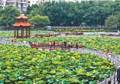 游客行走在廣西梧州市萬秀區(qū)潘塘公園廊道,賞荷游玩。