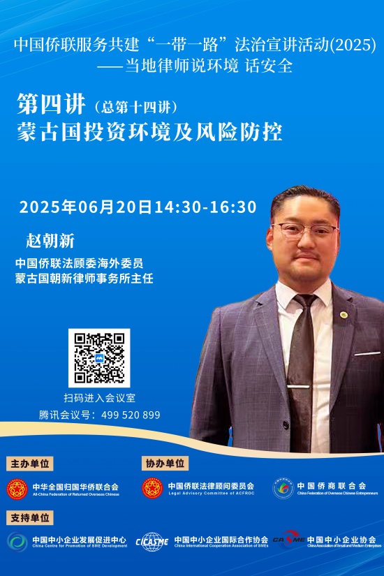 今年第四講(總第十四講)將于2025年6月20日(周五)14:30開播,由中國僑聯(lián)法顧委海外委員蒙古國趙朝新律師主講。趙朝新律師1991年出生于蒙古國烏蘭巴托市,2013年畢業(yè)于中國暨南大學(xué)法學(xué)院,后在蒙古國國家行政管理學(xué)院進修政府法務(wù)管理,是蒙古國目前唯一一位獲得律師資格證的中國公民。趙律師曾擔(dān)任蒙古國中國和平統(tǒng)一促進會、蒙古國浙江商會和多家中資企業(yè)的法律顧問,2021年創(chuàng)立了蒙古國朝新律師事務(wù)所。該律所是蒙古國目前唯一一家由中國公民100%持股、具有從事蒙古國相關(guān)法律業(yè)務(wù)資格的本土律師事務(wù)所,為在蒙古國的中國公民和從事礦業(yè)、生產(chǎn)業(yè)、建筑業(yè)、銷售業(yè)、金融業(yè)等領(lǐng)域的中資企業(yè)提供專業(yè)、優(yōu)質(zhì)的法律服務(wù)。