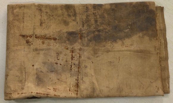 由于行車時間長、路況差、運載重,加上經(jīng)常遭遇日機追擊掃射甚至狂轟濫炸,機工們開的車常會發(fā)生故障。除極少數(shù)嚴重損壞外,絕大部分車輛需要就地緊急搶修。不論身處何地,也不論什么路況,車一旦拋錨,機工就需要迅速拿起工具包,將修車帆布往車底一鋪,鉆入車底檢修,并將拆下的零部件小心放在帆布上,使其不被塵土侵染,保證搶修后車輛的正常運轉。時間一長,零部件上的機油就滲透在這塊帆布上,留下大小不一的斑塊。這些斑痕成了那段歷史遺存的痕跡。利漢平在1949年回到梅縣時,把這塊帆布墊留在了老家,他的兒子利果林后來一直使用并將其保存下來,并于近日捐贈給僑博。