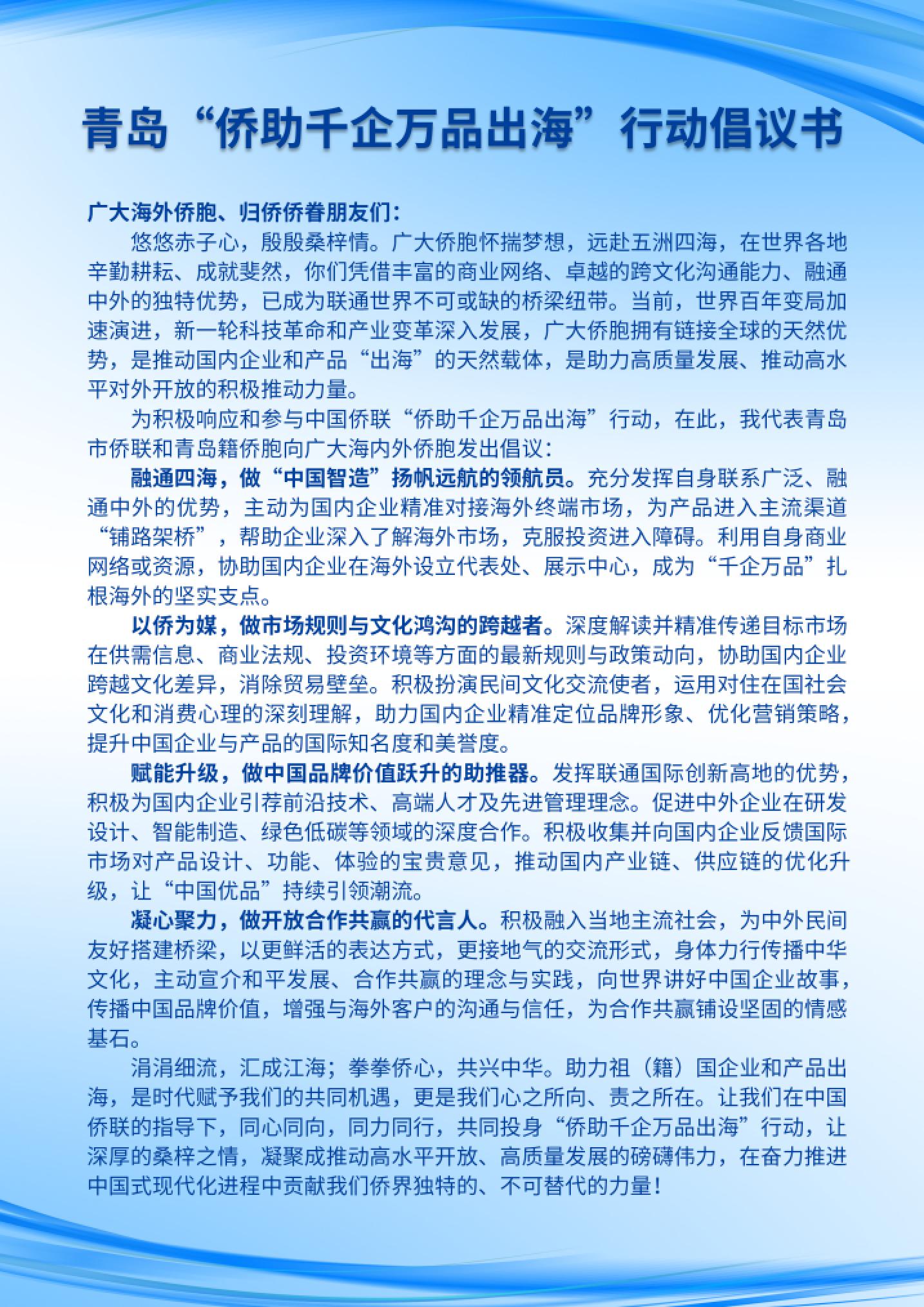 程紅、李興鈺等與會領(lǐng)導(dǎo)和僑界企業(yè)家代表共同啟動青島“僑助千企萬品出?!毙袆?,標(biāo)志著青島將深度參與由中國僑聯(lián)發(fā)起的這一全國性行動,利用僑界資源網(wǎng)絡(luò),助力本地企業(yè)和產(chǎn)品“走出去”。會上,宣讀了《青島“僑助千企萬品出?!毙袆映h書》,該倡議立足國家開放發(fā)展大局,從“融通四海,做‘中國智造’揚(yáng)帆遠(yuǎn)航的領(lǐng)航員”;“以僑為媒,做市場規(guī)則與文化鴻溝的跨越者”;“賦能升級,做中國品牌價值躍升的助推器”;“凝心聚力,做開放合作共贏的代言人”等四個方面,向廣大華僑華人發(fā)出攜手開拓企業(yè)和產(chǎn)品出海新境界的號召。