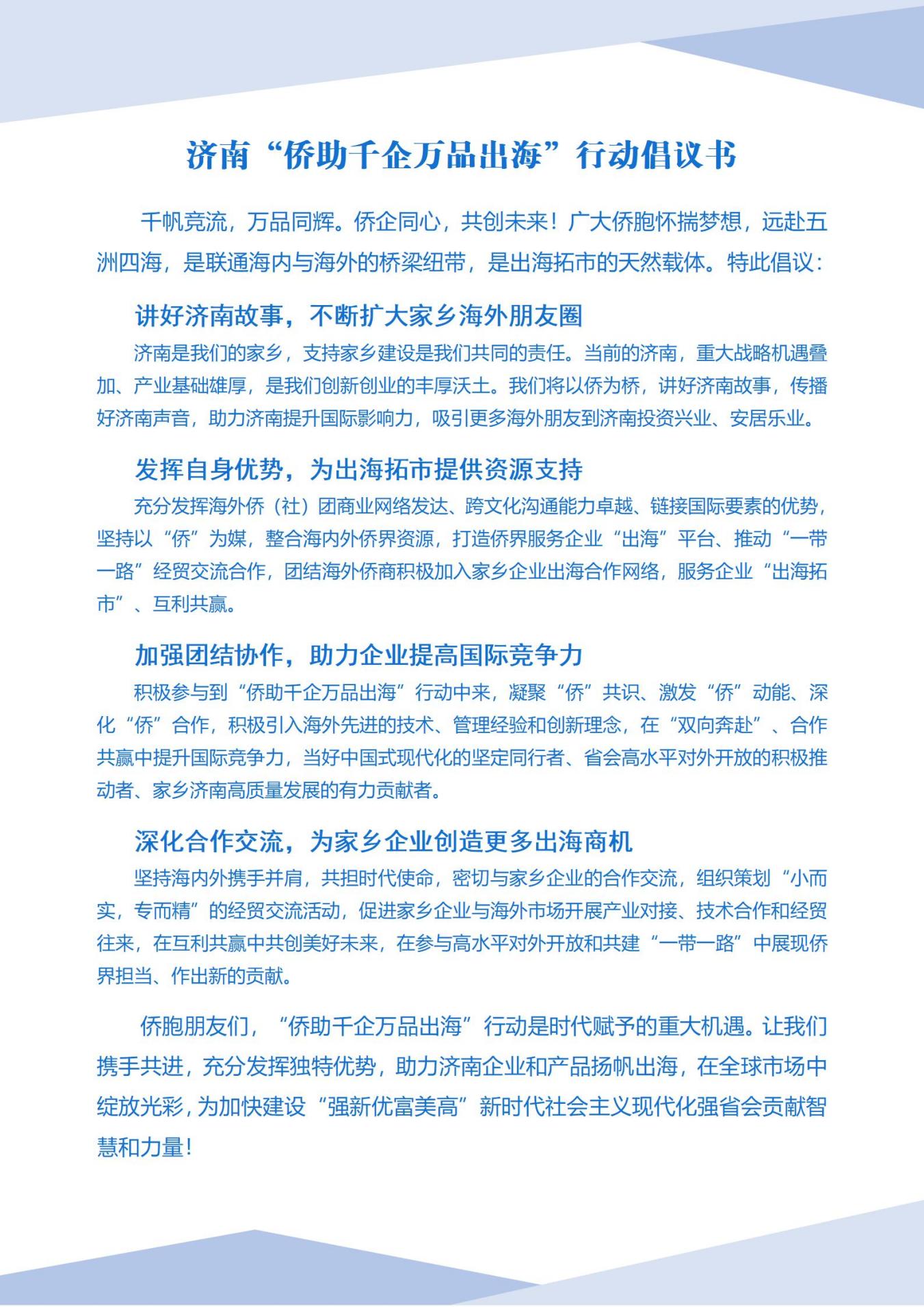 會(huì)上宣讀了《濟(jì)南“僑助千企萬(wàn)品出?!毙袆?dòng)倡議書》。得到僑胞積極響應(yīng),紛紛表示將充分發(fā)揮海外僑(社)團(tuán)資源豐富、人脈廣泛、鏈接國(guó)際要素的獨(dú)特優(yōu)勢(shì),積極參與到“僑助千企萬(wàn)品出?!毙袆?dòng)中來,以僑為橋、以內(nèi)聯(lián)外,為助力省會(huì)高水平對(duì)外開放、開創(chuàng)強(qiáng)省會(huì)建設(shè)新局面作出新貢獻(xiàn)。