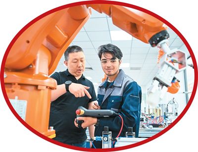 在天津現(xiàn)代職業(yè)技術(shù)學(xué)院魯班工坊實訓(xùn)教室,教師指導(dǎo)學(xué)生操作設(shè)備。