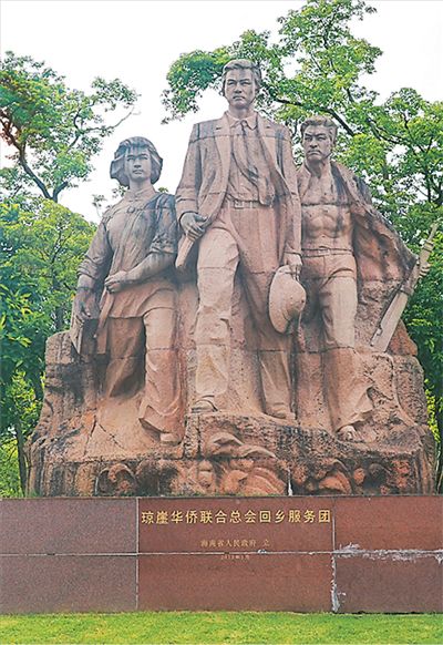 位于??谇嗌倌昊顒又行膹V場的“瓊崖華僑聯(lián)合總會回鄉(xiāng)服務(wù)團(tuán)”雕塑。本報記者 孫海天攝