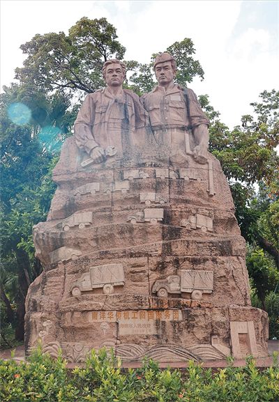 海南省??谑星嗌倌昊顒又行膹V場,描繪這兩支英雄隊伍的紀(jì)念雕像巍然矗立。南洋華僑機(jī)工回國服務(wù)團(tuán)的雕像基座上鐫刻著:“再會吧,南洋。你海波綠,海云長,你是我們第二的故鄉(xiāng)……我們要去爭取一線光明的希望?!?/p>