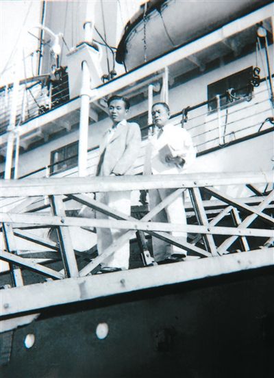 1939年6月初,符克率越南瓊崖華僑回鄉(xiāng)服務(wù)團(tuán)42名團(tuán)員,乘輪船取道香港回瓊參加抗戰(zhàn)。圖為符克(左)在輪船上留影。資料圖片(受訪者提供)