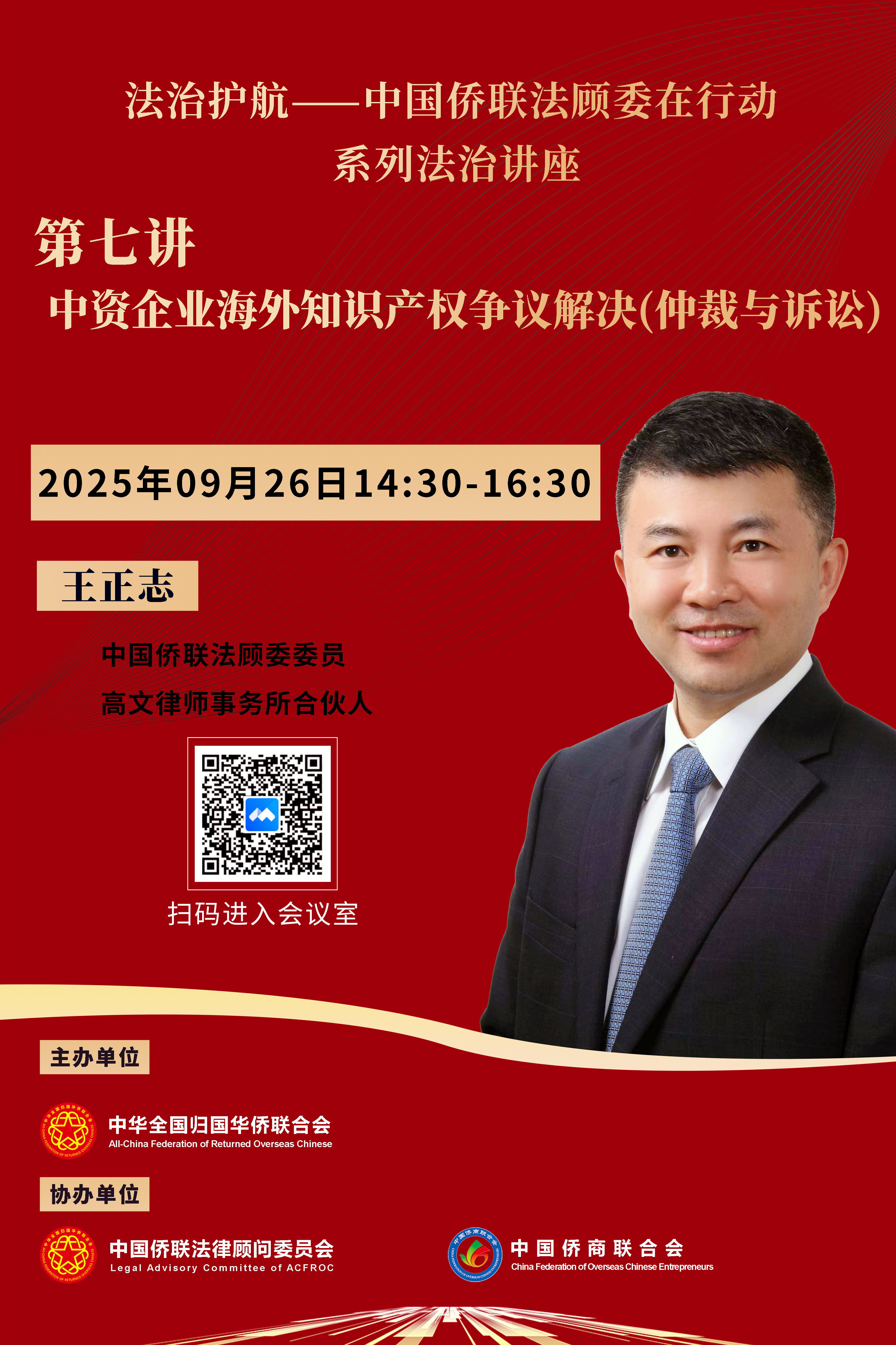 第七講將于9月26日(周五)14:30開播,由中國僑聯(lián)法顧委國際貿(mào)易與仲裁專委會(huì)委員、高文律師事務(wù)所合伙人王正志律師主講,題目是《中資企業(yè)海外知識(shí)產(chǎn)權(quán)爭議解決(仲裁與訴訟)》。聽課鏈接參見下方海報(bào)。