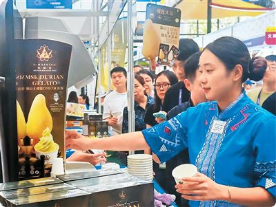 在東盟國家展區(qū)馬來西亞館,一款造型酷似榴蓮果肉的冰激凌成了“明星展品”,人們在“榴蓮大哥”品牌展位前排起長隊?!暗诙蝸頄|博會,展位大了一倍,人也多到忙不過來!”馬來西亞“榴蓮大哥”集團負責人吳聯(lián)波正忙著招呼顧客。
