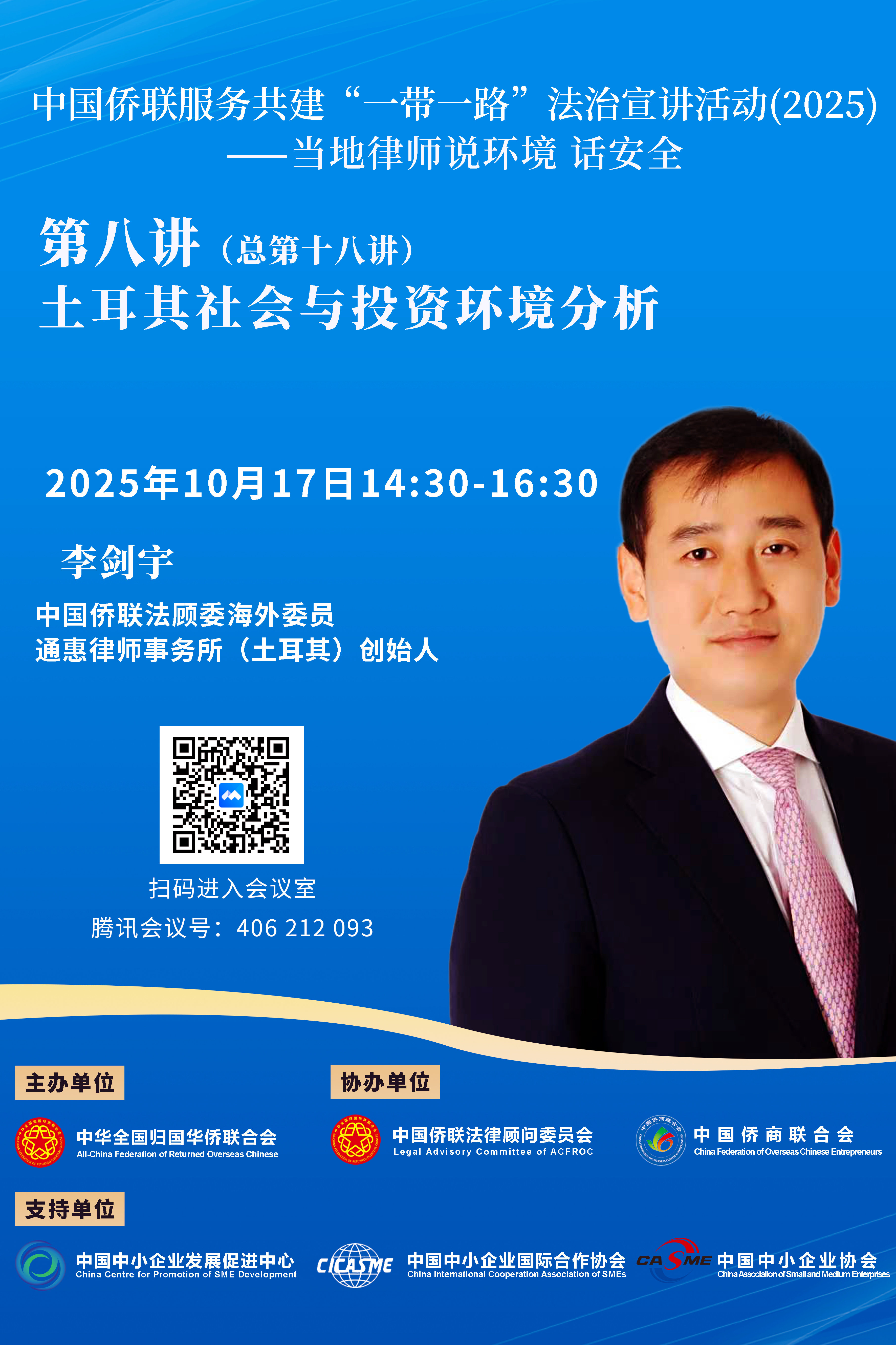 今年第八講(總第十八講)將于2025年10月17日(周五)14:30開(kāi)播,由中國(guó)僑聯(lián)法顧委海外委員土耳其李劍宇律師主講。李律師畢業(yè)于大連大學(xué),獲國(guó)際經(jīng)濟(jì)法學(xué)士學(xué)位,畢業(yè)后先后在競(jìng)天公誠(chéng)律師事務(wù)所、海華永泰律師事務(wù)所、上海復(fù)軒律師事務(wù)所擔(dān)任律師,參與不同企業(yè)上市、重組、投資及商業(yè)訴訟項(xiàng)目,廣泛接觸各類經(jīng)濟(jì)行業(yè)。2020年李律師赴土耳其創(chuàng)辦通惠律師事務(wù)所,為廣大中資企業(yè)與中國(guó)公民提供法律服務(wù),并多次舉辦公益法律服務(wù)講座,助力中資企業(yè)與中國(guó)公民更好維護(hù)權(quán)益。