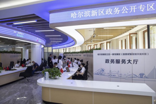 2022年7月12日,市民在黑龍江省哈爾濱新區(qū)江北一體發(fā)展區(qū)(自貿(mào)試驗(yàn)區(qū)哈爾濱片區(qū))政務(wù)服務(wù)大廳辦理業(yè)務(wù)。新華社記者 張濤 攝