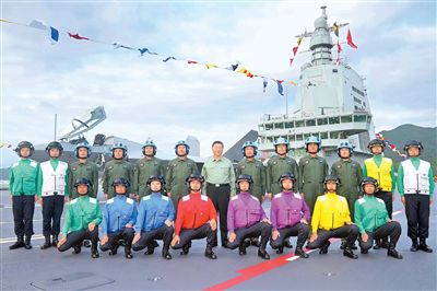 11月5日,我國第一艘電磁彈射型航空母艦福建艦入列授旗儀式在海南三亞某軍港舉行。中共中央總書記、國家主席、中央軍委主席習近平出席入列授旗儀式并登艦視察。這是習近平同艦載機飛行員、航空保障人員合影留念。