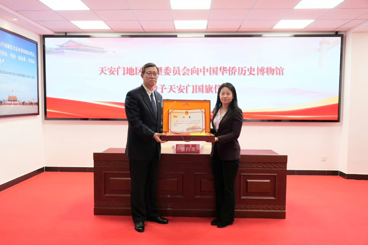 2025年11月28日下午,北京市人民政府天安門地區(qū)管理委員會在天安門國旗教育館舉行莊嚴儀式,向中國華僑歷史博物館贈予2014年10月21日在天安門廣場升起的中華人民共和國國旗。副館長雷霆代表僑博出席儀式并接受贈旗。
