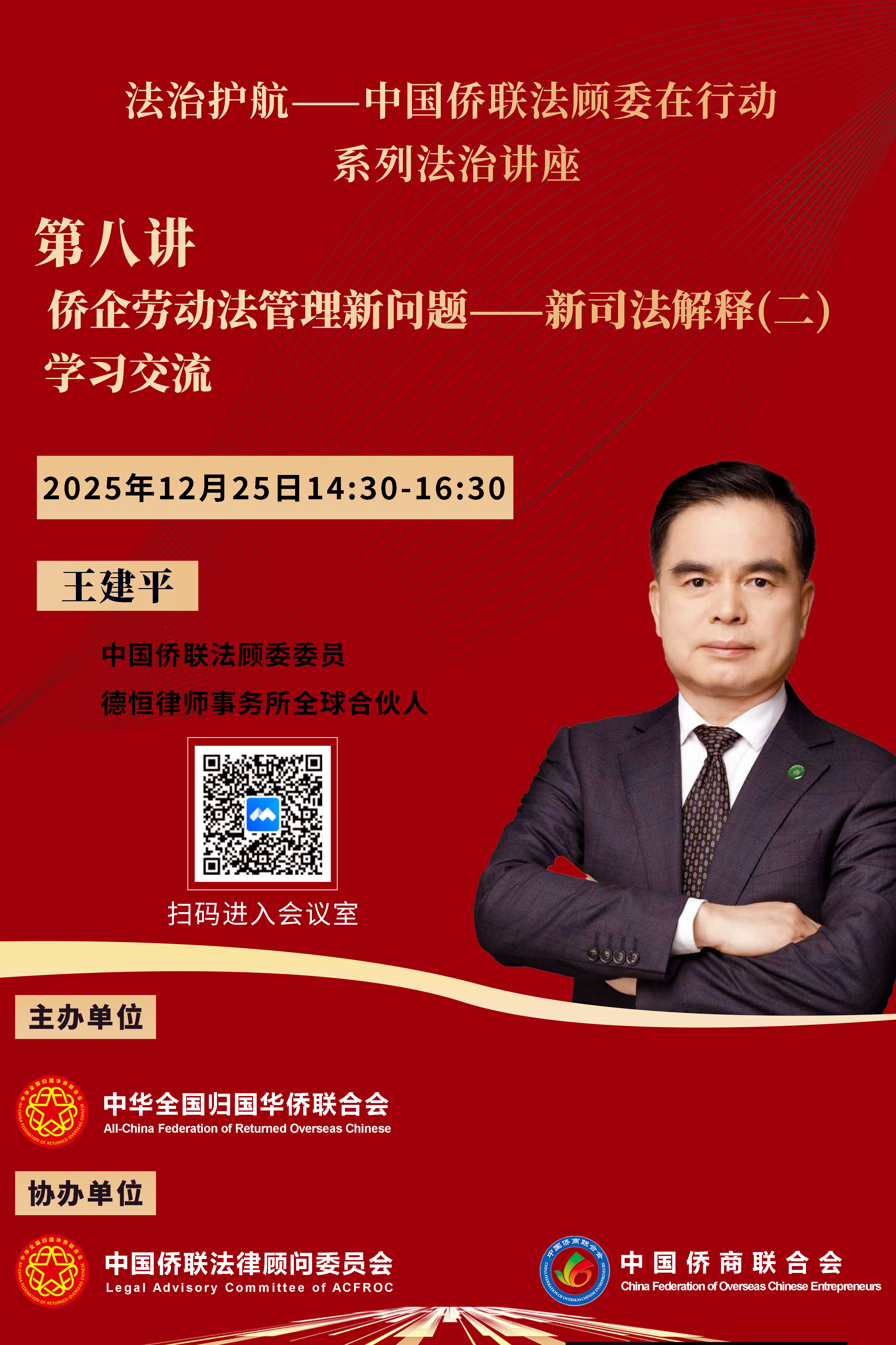 第八講將于12月25日(周四)14:30開播,由中國僑聯(lián)法顧委行政勞動(dòng)專委會(huì)主任、德恒律師事務(wù)所全球合伙人王建平律師主講,題目是《僑企勞動(dòng)法管理新問題——新司法解釋(二)學(xué)習(xí)交流》。聽課鏈接參見下方海報(bào)。